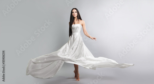 © akvafoto2012, Naklejka premium fashion photo of young girl in white dress flying tissue. Lightweight material. Grey background