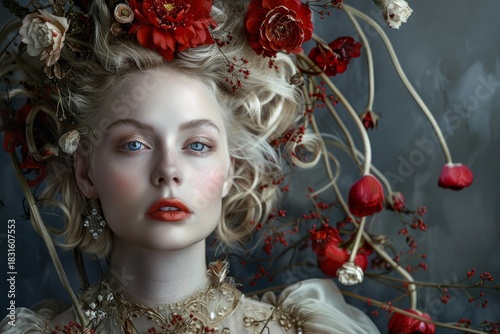 © nsit0108, Naklejka premium Fashion portrait of a blonde model posing with red flowers and gold dress