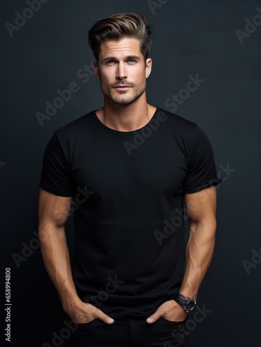 Naklejka premium Fashion portrait of handsome male model wearing black t-shirt and pants and...