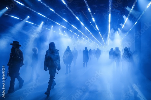 © neirfy, Fototapeta premium Fashion Show Runway glows in Blue Light Tunnel, displaying Elegant Silhouettes emanating sophistication and glamour