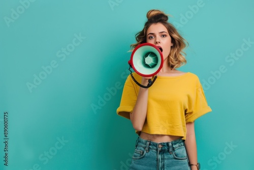 © Ольга Лукьяненко, Fototapeta premium fashion woman shouting through megaphone on color background