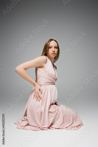 Fototapeta premium Fashionable and fair haired pregnant woman with natural makeup in pink dress looking at camera while sitting on grey background, elegant and stylish pregnancy attire, sensuality, mother-to-be