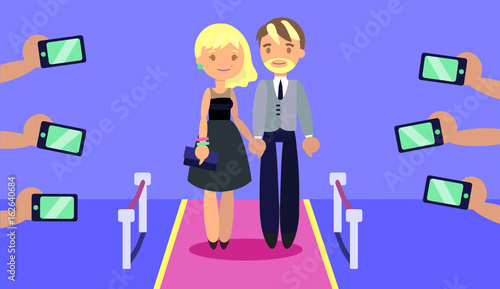 Fototapeta premium Fashionable couple on red carpet with paparazzi's hands taking photoes with phones. Flat style. Layered illustration. Can be used for motion design or another design project.
