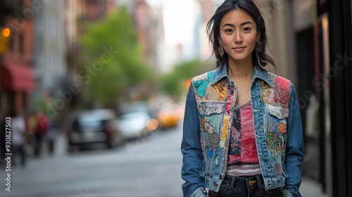 Fototapeta premium Fashionable Individual in Patchwork Denim Jacket with Embellishments Standing in Trendy City Setting