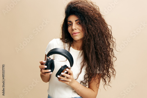 © SHOTPRIME STUDIO, Obraz premium Fashionable Latin woman with afro ready to enjoying cool songs, hold wireless headphones, close eyes, stay isolated near beige wall. Copy free space for design ad. Fashion IT Seasonal Sale concept