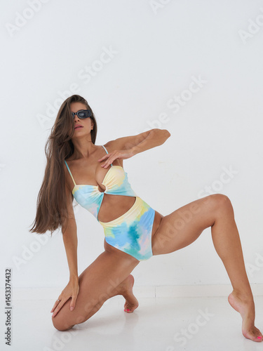 © Dmitry Tsvetkov, Obraz premium Fashionable model demonstrates style in studio setting with vibrant swimwear