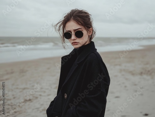 © The 2R Artificiality, Fototapeta premium fashionable portrait of a young brunette woman wearing black jeans T-shirt and coat with round sunglasses against an empty beach backdrop on a cold overcast autumn day
