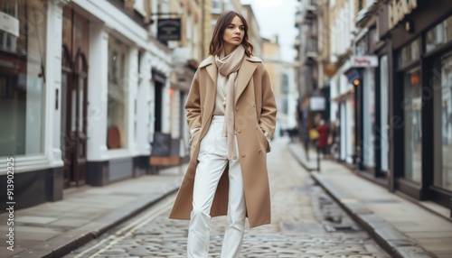 Naklejka premium Fashionable woman in beige coat walking down a cobblestone street in a...