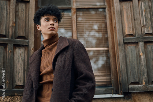 © SHOTPRIME STUDIO, Fototapeta premium Fashionable young african american woman in a brown coat posing in front of an old building with wooden shutters and a door