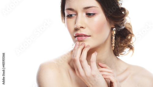 Fototapeta premium Fashionable young bride. Studio portrait over white background. Beautiful model with bridal makeup and hairstyle.
