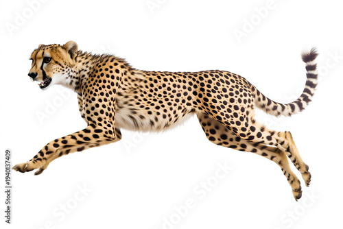 Fototapeta premium Fast cheetah sprinting and jumping side profile view isolated on white background