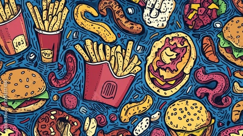 Fototapeta premium Fast Food Doodle Art Pattern Design with Simple Shapes and Colors