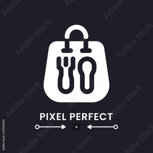 Naklejka premium Fast food package white solid desktop icon. Delivery service. Restaurant takeaway menu. Pixel perfect, outline 4px. Silhouette symbol for dark mode. Glyph pictogram. Vector isolated image