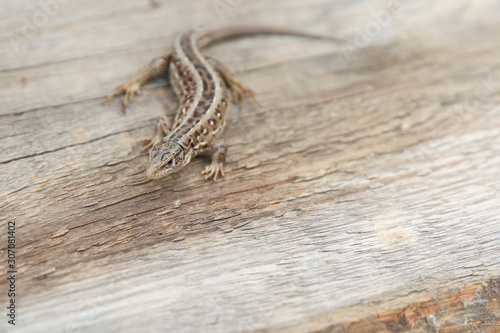 © Petr Smagin, Obraz premium fast lizard on a wooden surface with copy space