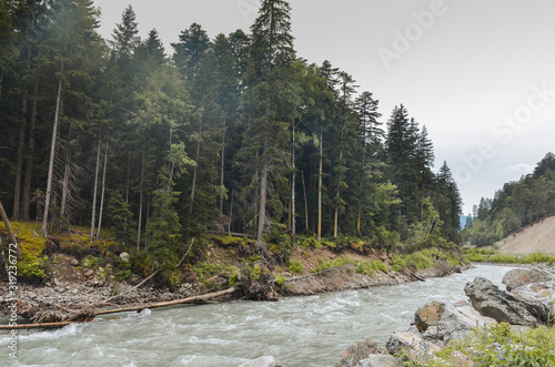 Obraz premium Fast mountain river against the background of a pine forest on cloudy days.