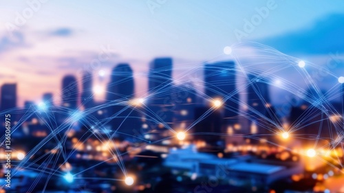 © Iaroslav, Obraz premium Fast moving light trails between skyscrapers at sunset in a big city