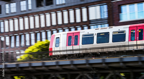 © Ievgen Skrypko, Obraz premium Fast Moving Metro Train By Elevated Track In Hamburg