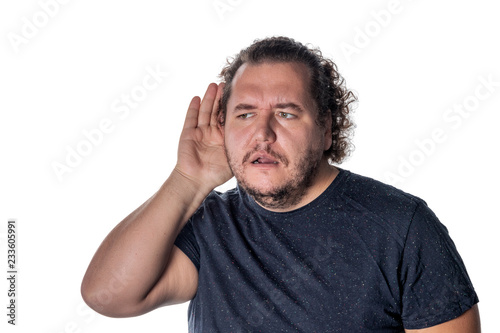 © Dmitry_Tkachev, Naklejka premium Fat man, trying to hear someone putting his hand on his ear, standing on a white background
