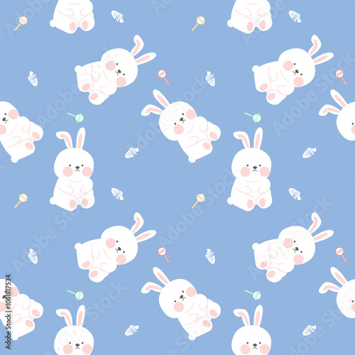 Fototapeta premium Fat rabbit cartoon so cute eat dessert. On lollipop ice cream and light blue background. Pattern seamless vector illustration.