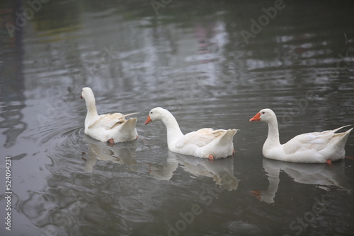 © LT, Fototapeta premium Fat white gooses swims on the lake