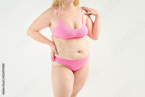 © staras, Naklejka premium Fat woman in pink underwear on gray background, overweight female, obesity body, weight loss concept