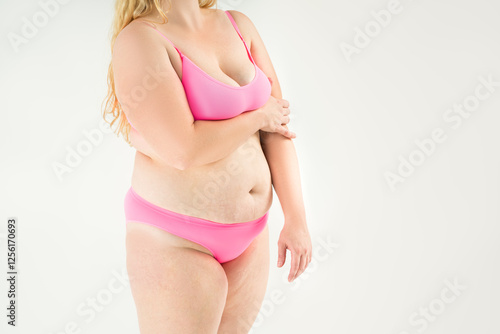© staras, Naklejka premium Fat woman in pink underwear on gray background, overweight female, obesity body, weight loss concept