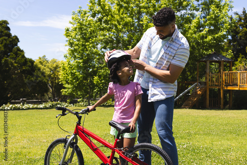 Naklejka premium Father adjusting daughter's helmet while she prepares to ride bicycle in park
