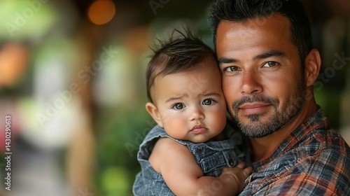 © Adobe, Fototapeta premium Father and baby outdoors, happy family, blurred background, for family website