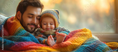 © Wiryo, Obraz premium Father and baby snuggle under a colorful blanket near a window.