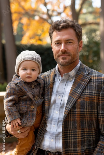 © Ben, Fototapeta premium Father and baby son in matching plaid outfits, enjoying a sunny autumn day in the park, highlighting the warmth and love of family bonding, Generative AI