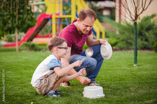 © lobodaphoto, Fototapeta premium father and child playing in green park