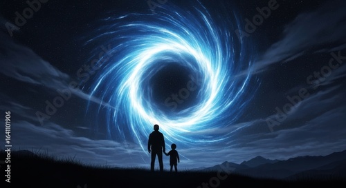 Fototapeta premium Father and child silhouette gazing at a mesmerizing swirling blue energy vortex portal in the night sky