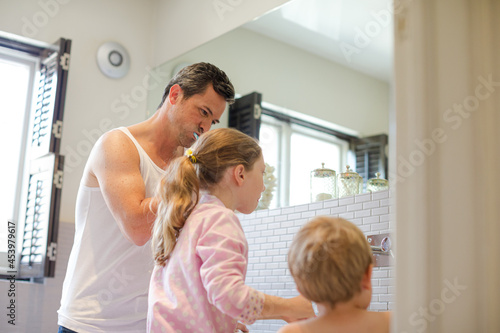 © KOTO, Fototapeta premium Father and children brushing teeth in bathroom