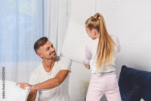 Fototapeta premium Father and daughter having pillow fight in bedroom