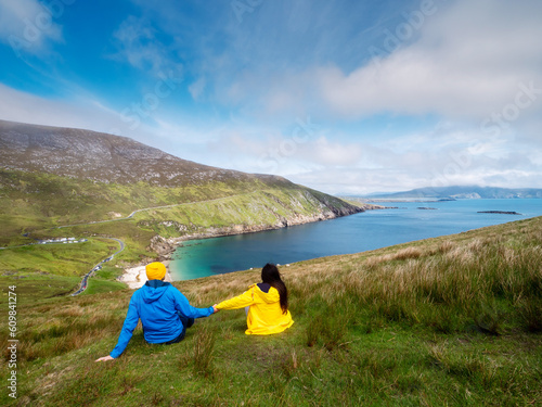 © mark_gusev, Naklejka premium Father and daughter on a trip to nature with stunning view. Nature scene in the background with mountains, beach, ocean and cloudy sky. Separated after divorce family concept. Parent day theme.