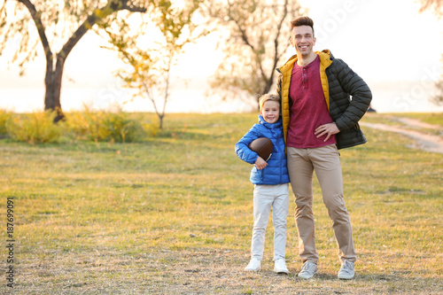 © Africa Studio, Fototapeta premium Father and little son with rugby ball outdoors