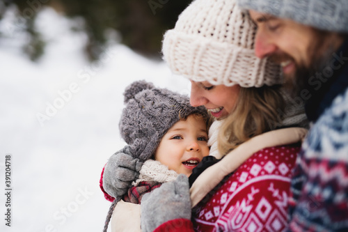 © Halfpoint, Obraz premium Father and mother with small child in winter nature, standing in the snow.