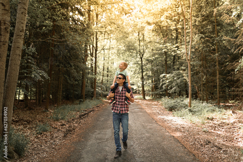Fototapeta premium Father and son enjoying a nature walk hike in the forest