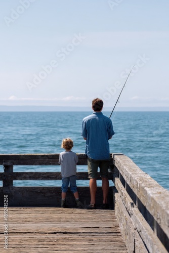 © Iryna, Fototapeta premium Father and son fishing on pier with ocean view
