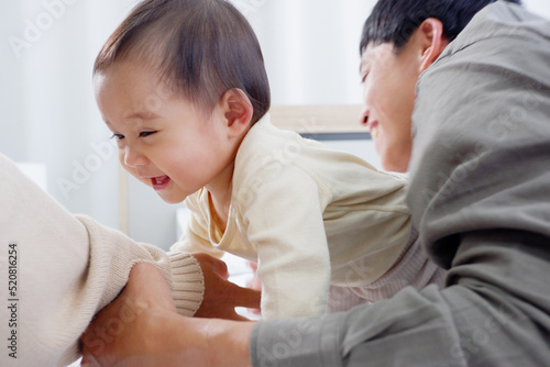 © krongthip, Fototapeta premium Father and son lie down and play with happy smiles.