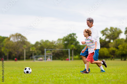 Obraz premium Father and son play football. Dad and kid run.
