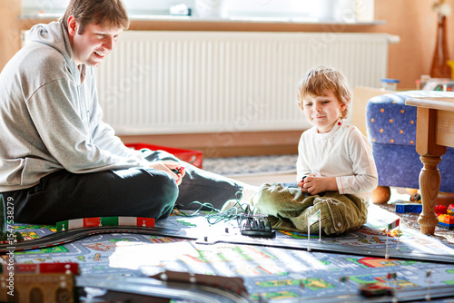 © Irina Schmidt, Fototapeta premium Father and son playing with racing cars on racetrack, indoors, with cars. Happy little preschool boy and young man having fun with indoor race game