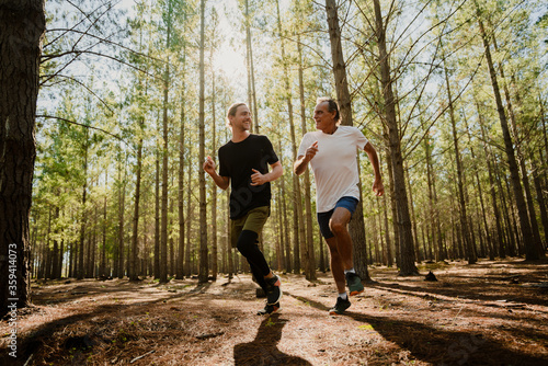 Fototapeta premium Father and son running in the woods together, exercising and keeping fit