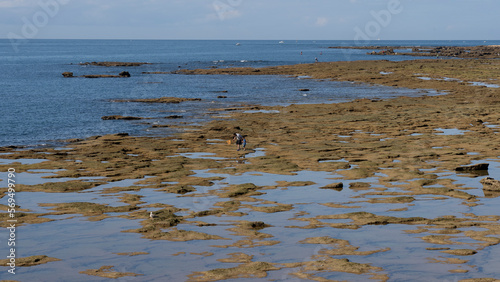 Fototapeta premium Father and son shellfishing at low tide on the beach of Caleta, Cádiz. Spain