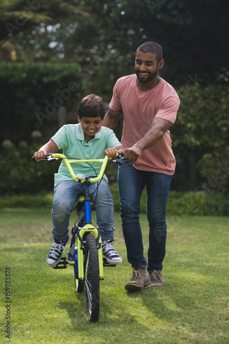 © wavebreak3, Obraz premium Father assisting son while riding bicycle
