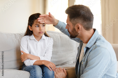 © Prostock-studio, Obraz premium Father Caring For Sick Daughter With Fever Touching Forehead Indoor