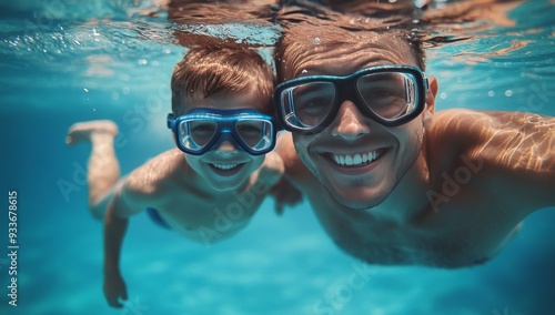 © ryanbagoez, Naklejka premium Father & daughter swimming underwater in a pool on summer vacation. Googles water action shot.