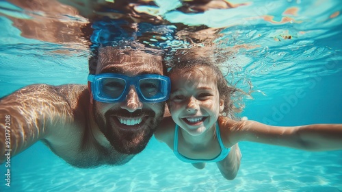 © Ganesha88, Fototapeta premium Father & daughter swimming underwater in a pool on summer vacation. Googles water action shot. Happy family on holiday. Learning to swim. Blue Father's day banner concept