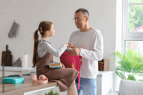 Fototapeta premium Father helping his little daughter to pack schoolbag in kitchen