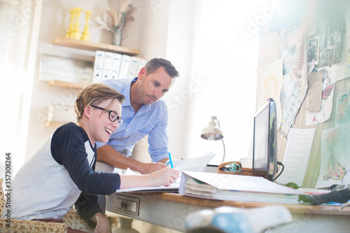Fototapeta premium Father helping teenage son doing his homework in room